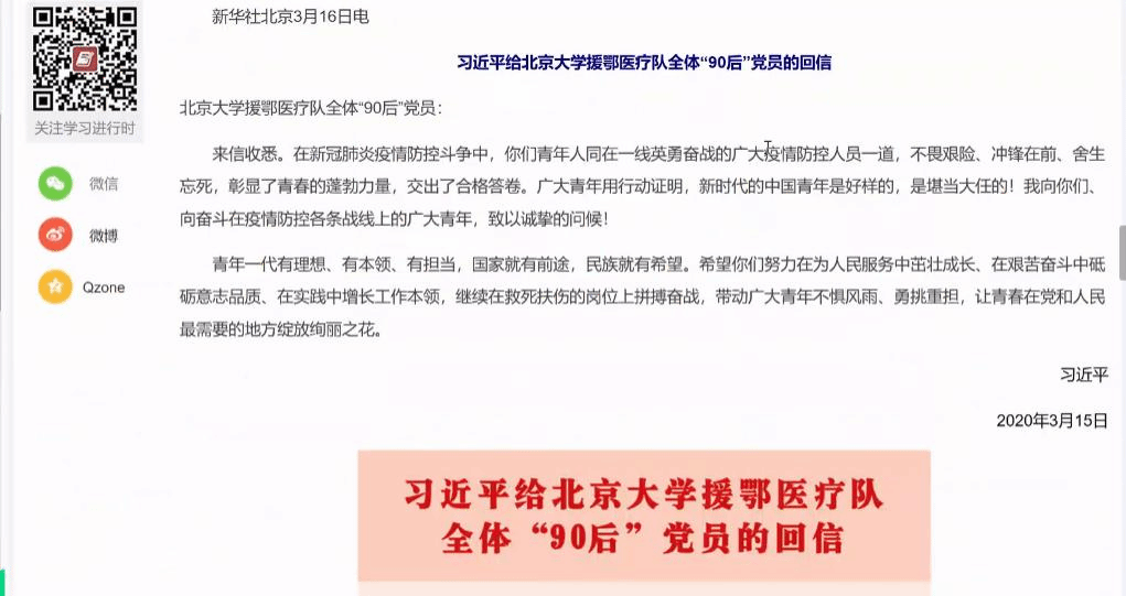 为深入学习习近平总书记在给北京大学援鄂医疗队全体“90后”党员回信中的责任与奉献精神,坚定广大青年对打赢这场疫情阻击战的信心,近期,永利官网团委组织各基层团支部开展“学总书记回信,话青春担当”主题团日活动。各团支部依托线上视频、青年大学习、腾讯会议等网络平台,深入学习习近平总书记在回信中的指示精神。学院团委书记(主持工作)许彦指导主题团日的开展并参加多场主题团日活动。