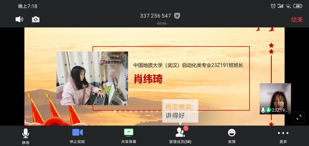 中国地质大学(武汉)自动化专业23Z191班尤际尧同学和中国石油大学(北京)物探18-1班徐雨寒同学尤际尧同学谈了学习体会。徐雨寒同学谈到,一是要抓好每天的学习,不能落下任何一门功课,做到“停课不停学,成长不延期”,做到自律、自护、不扎堆、少聚会;二是要自觉将个人梦想融入中国梦,坚定理想信念,矢志艰苦奋斗,为实现中国梦贡献青春力量。尤际尧同学说:“两周前的思政大课给我留下了深刻的印象,在疫情面前我看到了共产党员冲锋在前,勇于担当的精神,我看到了医护人员逆行的身影,我看到了一方有难、八方支援的责任担当,这一幕幕都让我感动不已。作为当代大学生,我们应该与祖国同呼吸共命运,在祖国需要的时候挺身而出,全力以赴地投入到工作学习之中,以青春之我创青春之国家。”