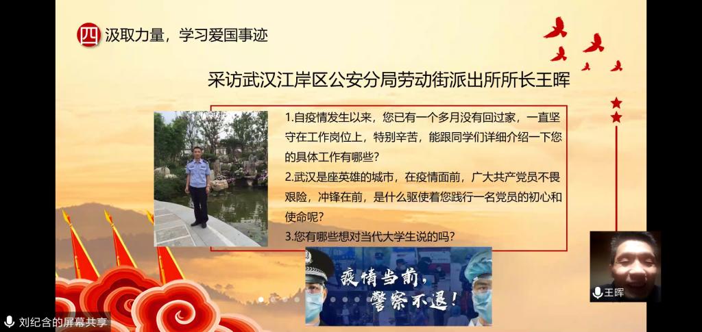 武汉市江岸区公安分局劳动街派出所所长王晖同志就自身负责的具体工作给同学们做了分享。王晖同志谈到,武汉市市委以及武汉市新冠肺炎防控指挥部位于本辖区内,一方面要做好辖区居民的安全稳定工作,另一方面要做好政府机关部门安全保障的工作。从123日凌晨五点他们就进入战时状态,执行武汉封城的紧急任务,至今已有一个多月没有回家了,所有的民警都在超负荷工作。王晖同志说:“作为一名共产党员,作为一名人民警察,守护人民群众的生命安全则无旁贷,要把党和人民的利益放在第一位,在危难时刻更应该坚守岗位,冲锋在前,用实际行动践行共产党员的初心和使命。”最后,他对当代大学生寄语期望,要树立远大理想,练就过硬专业本领,肩负当代青年的责任,不辜负这个伟大的时代。