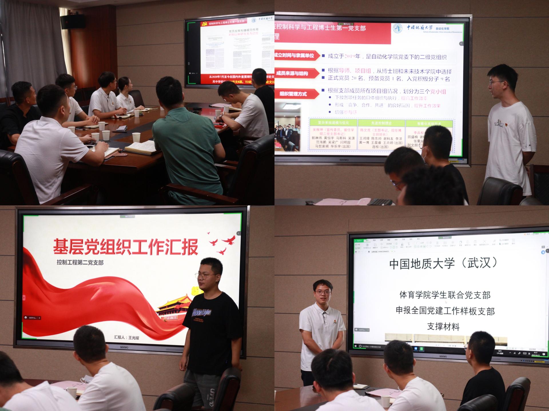 在齐唱国歌、重温入党誓词之后,学生党支部书记依次介绍了各自支部建设特色与成绩。陈文虎同志借助支自制党建视频,重点介绍了博一支部开展“云实践”、搭建“红星闪闪伴我行”分享平台等支部品牌活动;王光耀同志从思想政治学习和组织建设两方面介绍了专硕二支部的发展情况;蔡斯同志紧扣“攀登精神”主线,从组织建设、特色活动、党支部战斗堡垒作用、党员先锋模范作用方面详细介绍了在申报全国样板党支部过程中积累的先进经验。