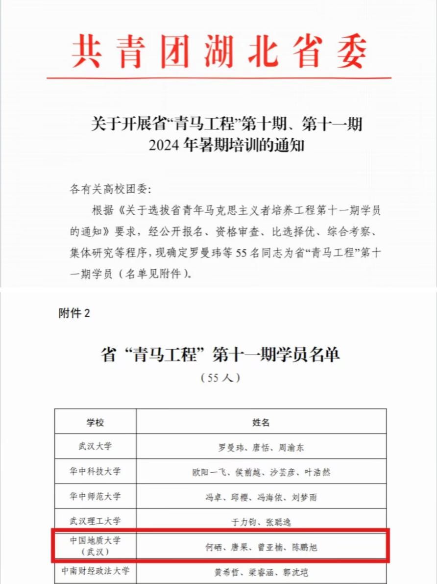 今年5月,共青团湖北省委、湖北省教育厅联合发布《关于选拔省青年马克思主义者培养工程第十一期学员的通知》,从湖北省20所高校中遴选55名大学生作为省“青马工程”第十一期学员。经公开报名、资格审查、比选择优、综合考察、集体研究等程序,永利官网2022级自动化专业本科生陈鹏旭同学成功入选!