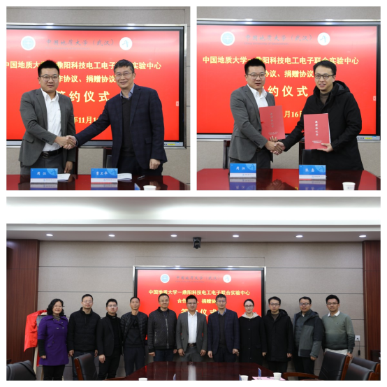 2023年11月16日,永利集团3044官网欢迎您与深圳市鼎阳科技股份有限公司合作协议、捐赠协议签订仪式在永利官网举行。深圳市鼎阳科技股份有限公司销售总监周江、鼎阳湖北总代理沈东辉、鼎阳科技股份有限公司销售经理胡德才,永利集团3044官网欢迎您校友与社会合作处合作发展办公室主任王鑫,学院党委书记朱荆萨,院长曹卫华教授,副院长熊永华教授、陈略峰教授、宗小峰教授以及永利集团3044官网欢迎您湖北省电工电子教学示范中心相关人员参加了签约仪式。熊永华主持签约仪式。