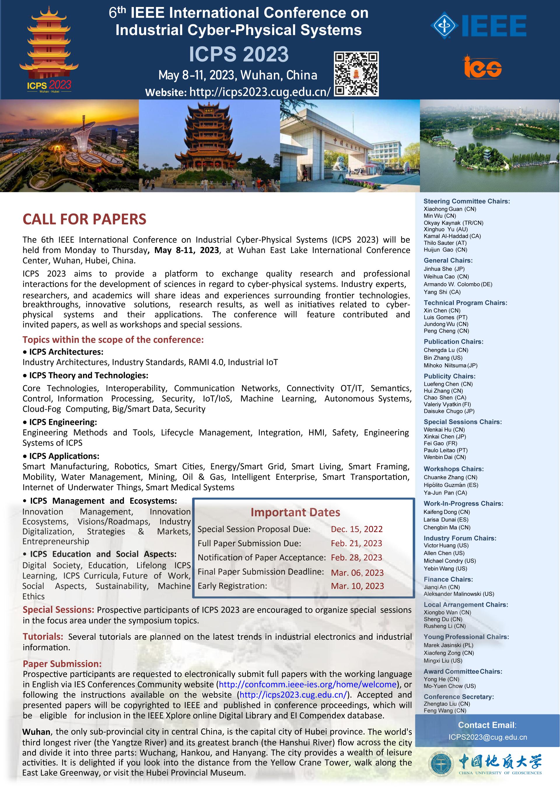 由永利官网承办的第6届IEEE工业信息物理系统国际会议(ICPS 2023)将于2023年5月8日至11日在武汉东湖国际会议中心举行。会议网站:http://icps2023.cug.edu.cn