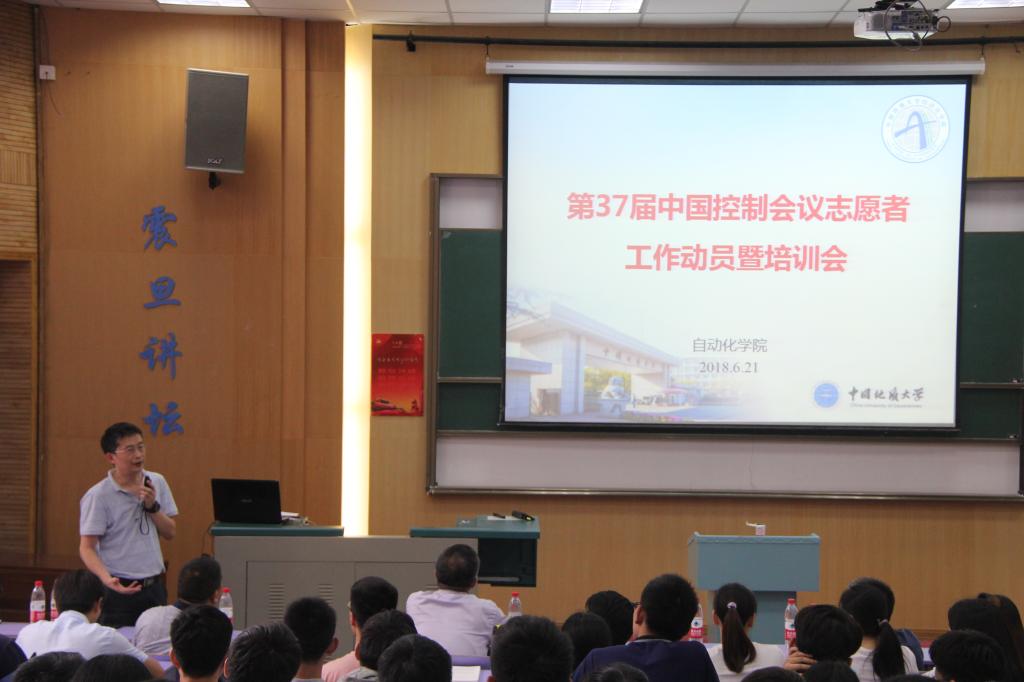 本次会议分两个部分进行,第一部分是动员会。首先由吴敏院长作动员讲话,吴院长强调本次会议规模庞大,预计将有2000余人参与本次会议,其中包括不少院士、长江学者和海内外杰出学者,其影响非常深远,所以这对本次志愿服务工作提出了很高的要求,为提升本次志愿服务工作质量,吴院长对在座的志愿者提出了五点要求:一是志愿者要足够重视这次会议,积极主动投入充足的热情到志愿服务工作中来;二是按时参加各小组的技能培训,明确分工与职责;三是注意纪律,上岗守时保质,上岗期间要展示良好的精神风貌;四是服从安排,明确分工,后期会根据志愿者的特性进行人员调配;五是强调本院参会代表注意礼让其他参会代表,保证会议有序进行。之后陈鑫老师从CCC2018的申办、目前会议的论文审稿工作以及正式会议期间各会场的工作安排三个方面对CCC2018作了简要介绍,同时表达了对大家积极报名参与本次会议志愿服务工作的赞扬与认可。随后曹卫华老师从主人翁意识出发,对志愿者提出了三点要求:第一是志愿者要积极主动,不轻易推脱责任,要尽自己最大的努力去帮助参会代表解决问题;第二是认真主动观察身边现象和状况,主动向参会代表提供帮助;第三是严格保证会议期间的秩序,注意防范突发状况。接下来谭文伦老师对CCC2018志愿者章程作了简要介绍。路康同学作为志愿者代表发言,表达了高质量完成本次志愿服务工作的决心与信心。最后何书记从会议的影响力、对志愿者的要求和安全管理意识三个方面作了总结讲话,到此第一部分动员会结束。