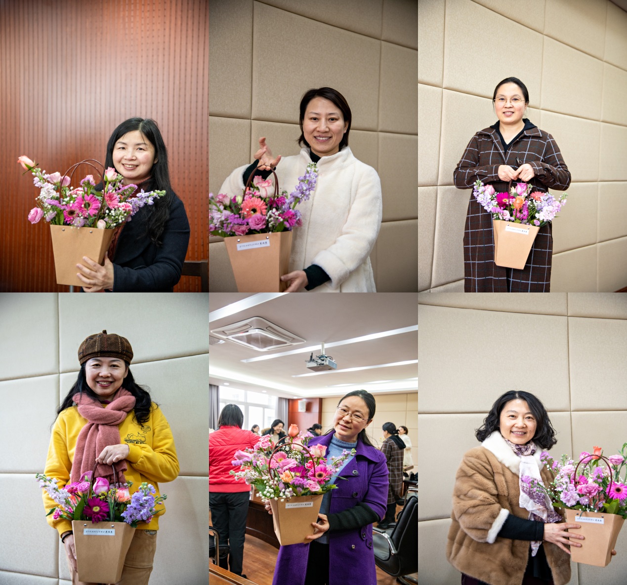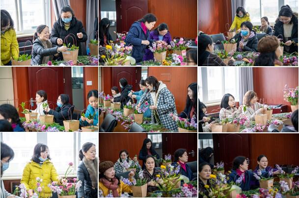 在花艺师的现场展示和指导下,各位女教工融合自己的巧妙构思,将各种各样不同颜色的花卉修枝剪叶,依次错落有致地插在一起。很快,一盆盆生机盎然的插花作品就在大家手中诞生。看着自己的作品,每位女教工都喜笑颜开。