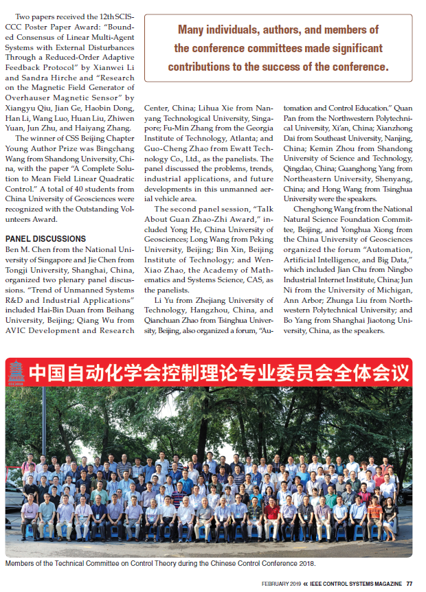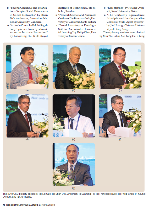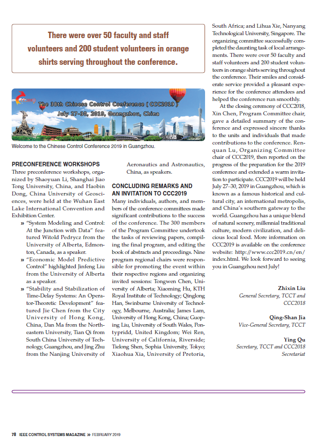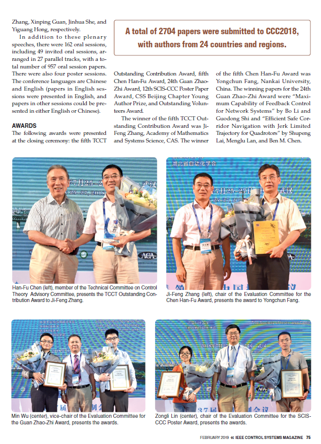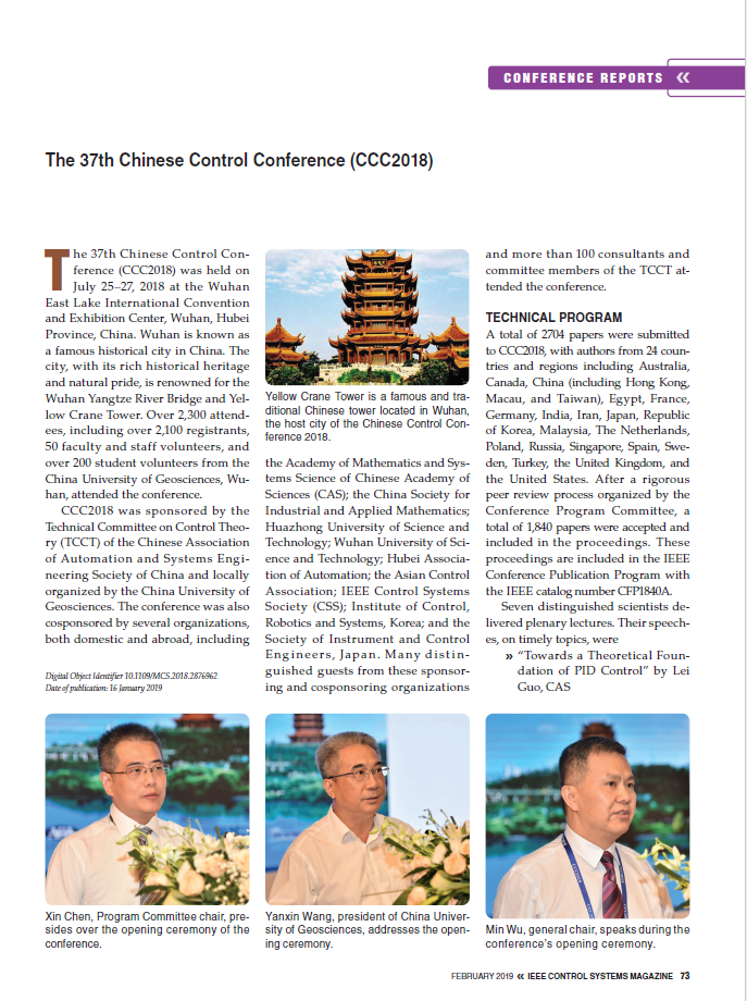 2018年7月25日至27日,由永利官网承办的第37届中国控制会议(CCC2018)获得圆满成功。本次会议受到国际学界关注,国际知名期刊《IEEE Control Systems Magazine》对会议作了大篇幅报道。