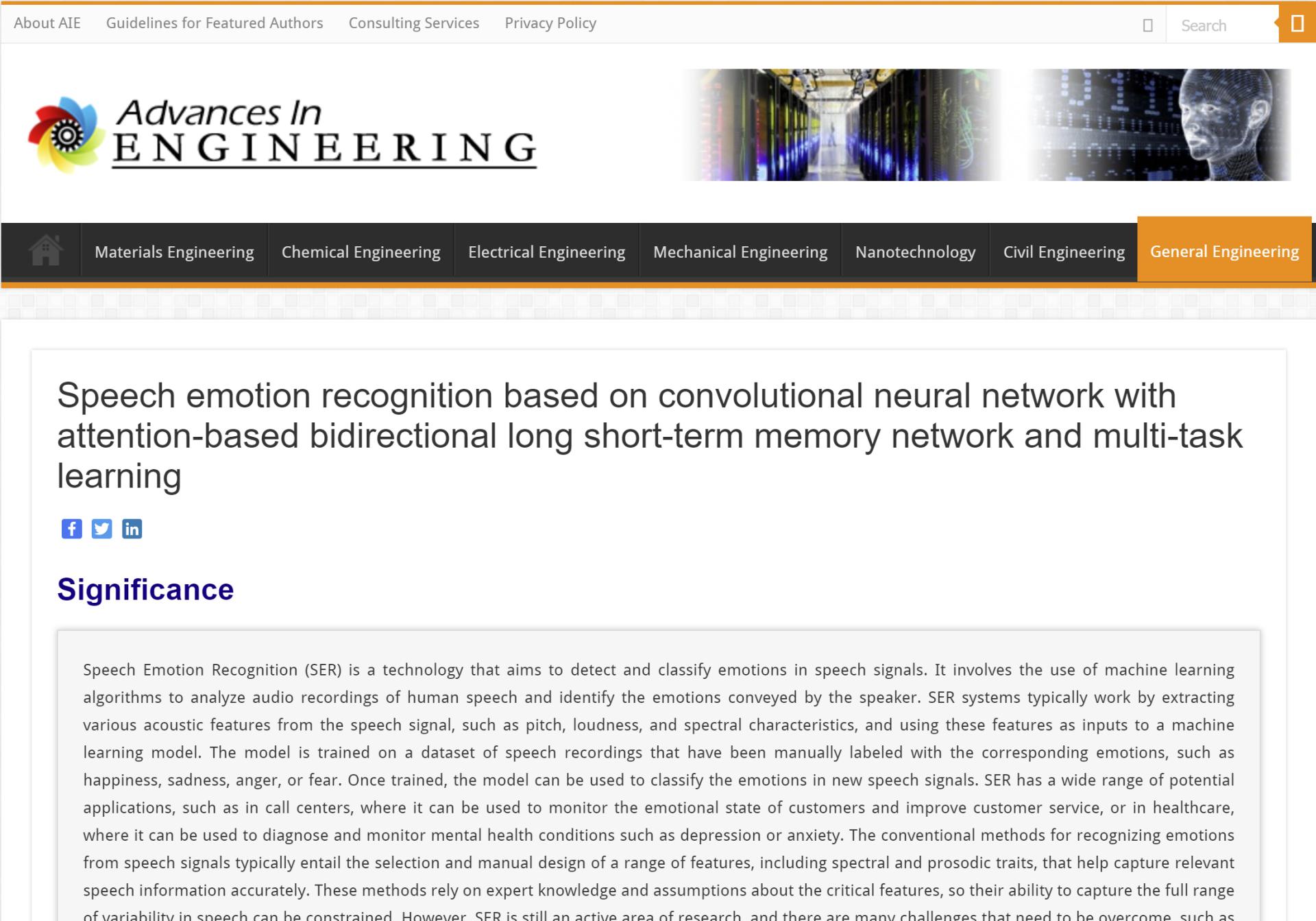 近日,国际工程领域机构Advances in Engineering (AIE) 对永利官网情感计算团队的最新研究成果——“Speech Emotion Recognition Based on Convolutional Neural Network with Attention-based Bidirectional Long Short-term Memory Network and Multi-task Learning”进行专题报道。AIE所报道的论文是由国际专家顾问组选出,方向包括通用工程、电子、机械、土木、纳米、材料、生物医学工程等,中选率为以上领域发表论文总数的1‰AIE拥有广泛的读者群,每月的阅读量超过75万次