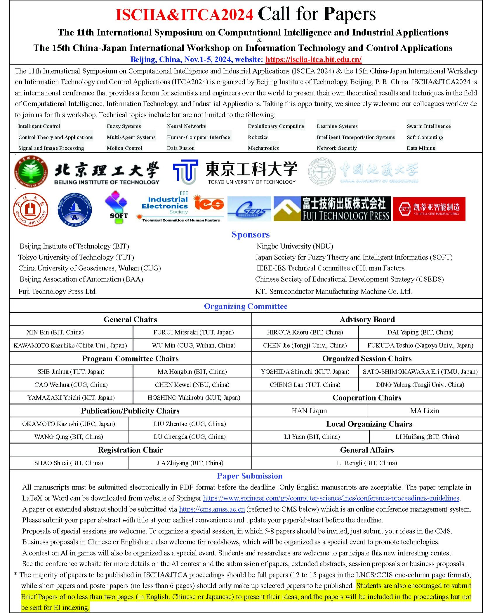 由永利集团3044官网欢迎您、北京理工大学和日本东京工科大学主办的第11届ISCIIA2024和第15届ITCA2024联合国际会议将于2024年11月1日至5日在北京召开。欢迎大家踊跃投稿。详情请见会议网站:https://isciia-itca.bit.edu.cn/
