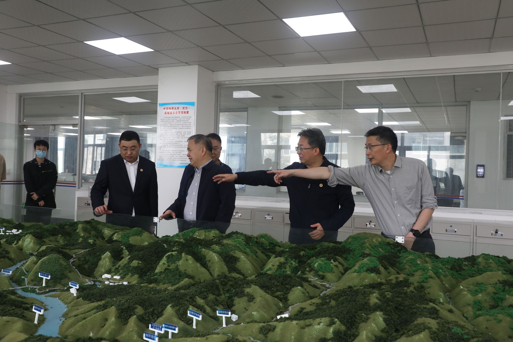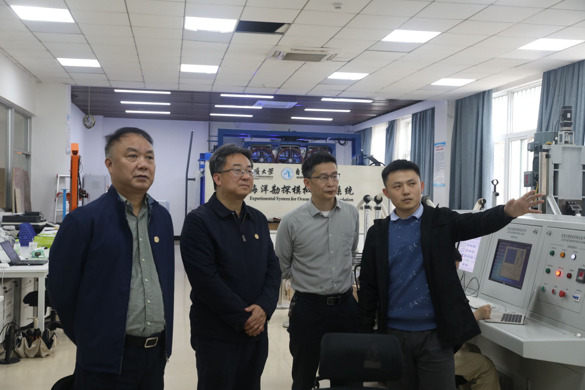 卫华院长带领王文军局长一行参观了院科研实验室,介绍地质钻探、海洋资源勘探、智能机器人等领域的研究成果和科研平台。