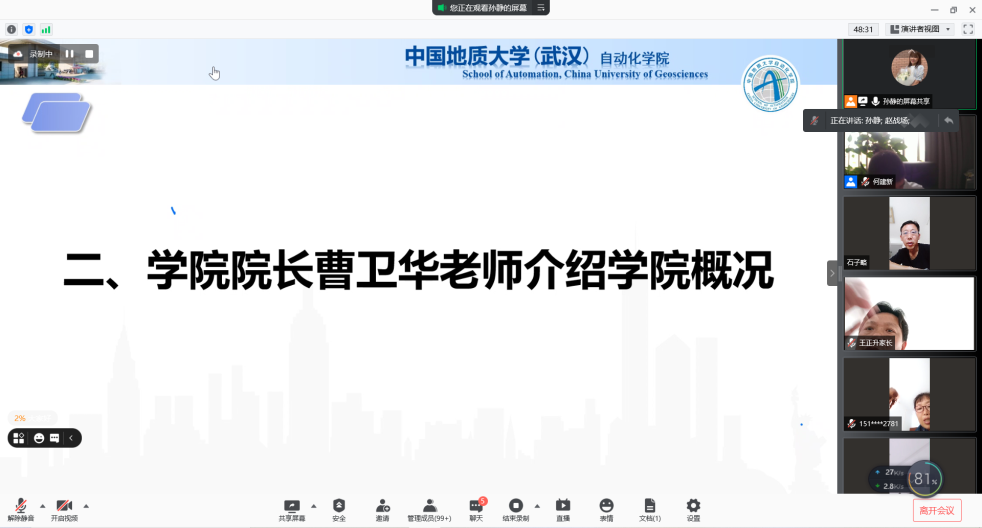 2021年9月4日上午10点,永利集团3044官网欢迎您召开2021级新生家长线上座谈会。院党委书记董浩斌老师、院长曹卫华老师、院党委副书记何建新老师、副院长陈鑫老师、副院长宗小峰老师、副院长熊永华老师、副院长陈略峰老师、自动控制系系主任安剑奇老师、测控技术与仪器系系主任董凯锋老师、智能系统研究所所长刘振焘老师以及其他老师参加本次座谈会。学院召开此次新生家长座谈会旨在更好促进家校联合,让家长们对学校和学院有更加深入地了解。