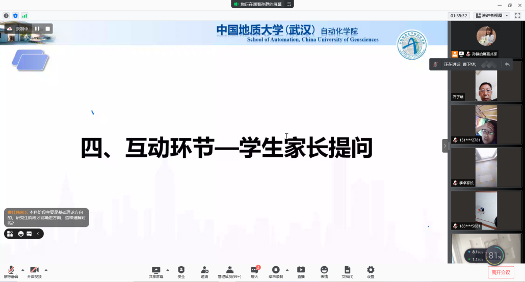 随后,座谈会进入到了家长提问环节。院领导与新生家长进行互动交流,新生家长们积极发言,就军训安排、学院学科设置、实习情况、主要研究方向、进入实验室、保研率等问题进行了广泛发言,学院领导和老师们也都一一进行了回答。