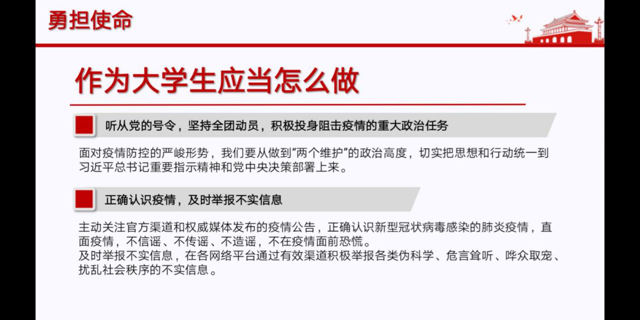 此次班会内容简洁全面,参会同学听讲认真,积极参与互动,班会整体氛围良好。在所有与会人员的共同努力下,此次“众志成城抗疫情,同舟共济渡时艰”主题班会圆满结束。