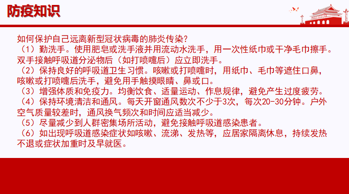首先,白睿豪同学简要介绍了什么是新冠肺炎、新冠肺炎的常见症状以及相关防控措施。期间,几位同学也主动将自己了解的知识分享给他人。而后,白睿豪同学对于线上学习提出要求,一是要回归正常的学习生活状态,不可因为缺乏管束而有所懈怠;二是应当加强锻炼,在保证安全的前提下多运动,不做“粘在床上”的人。