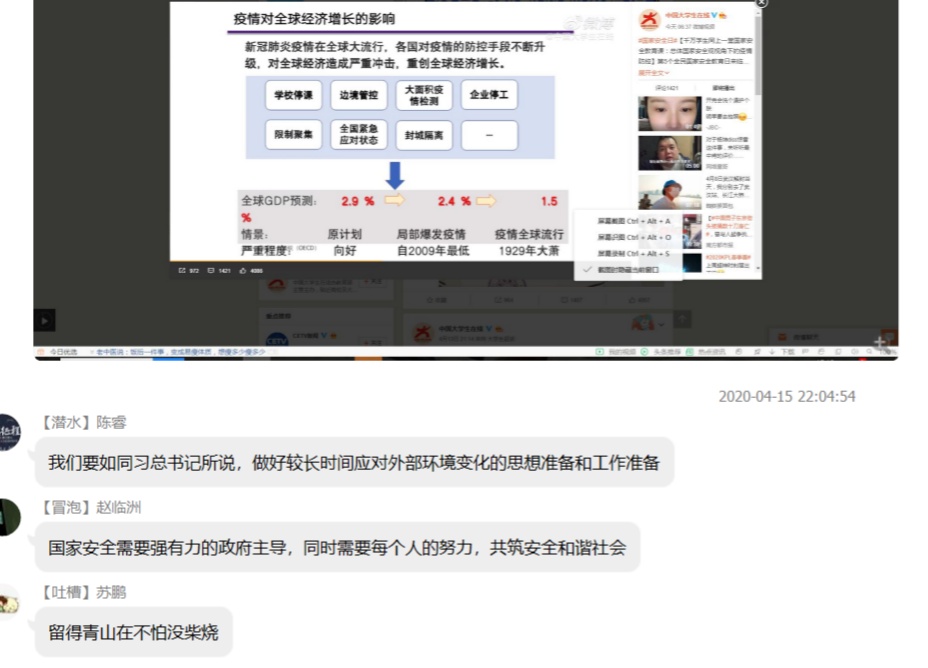 为提高全民国家安全意识,防范化解各领域重大风险,落实好教育部、湖北省教育厅关于开展“4·15”全民国家安全教育日活动相关要求,永利集团3044官网欢迎您高度重视、统筹安排,组织本研所有班级观看学习《总体国家安全观视角下的疫情防控》和《生物安全与公共卫生安全专家访谈》教育课程。这两场国家安全教育课在全体学生中引发了热烈反响和讨论,同学们留下了一段段感人肺腑的
