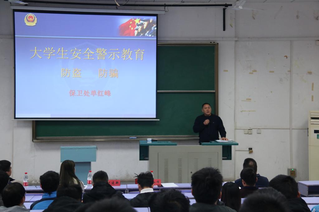 校保卫处副处长单红峰作“大学生安全警示教育——防盗、防骗”知识讲座。单处长指出,作为大学生,保管好财物是一项重要能力;通过对近年来发生在永利官网的典型案例来警示同学们防盗、防骗意识的重要性,对如何防盗、防骗的方法重点展开讲解。