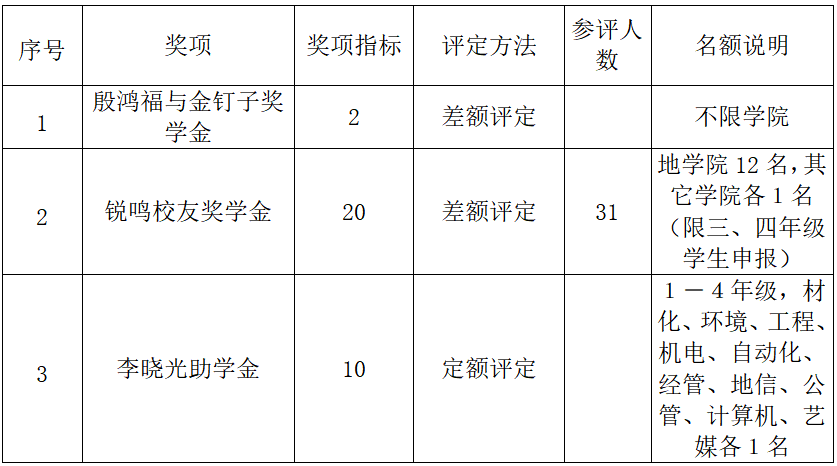 “锐鸣校友奖学金”奖励地学院10名学生,10名其它学院学生。(地学院推选12名学生,其它学院各推荐1名,学校奖学金委员会评选地学院12名,其它学院12名。本科生限定为三、四年级学生。最终由校友冯锐和程鸣先生确定20名获奖学生。)