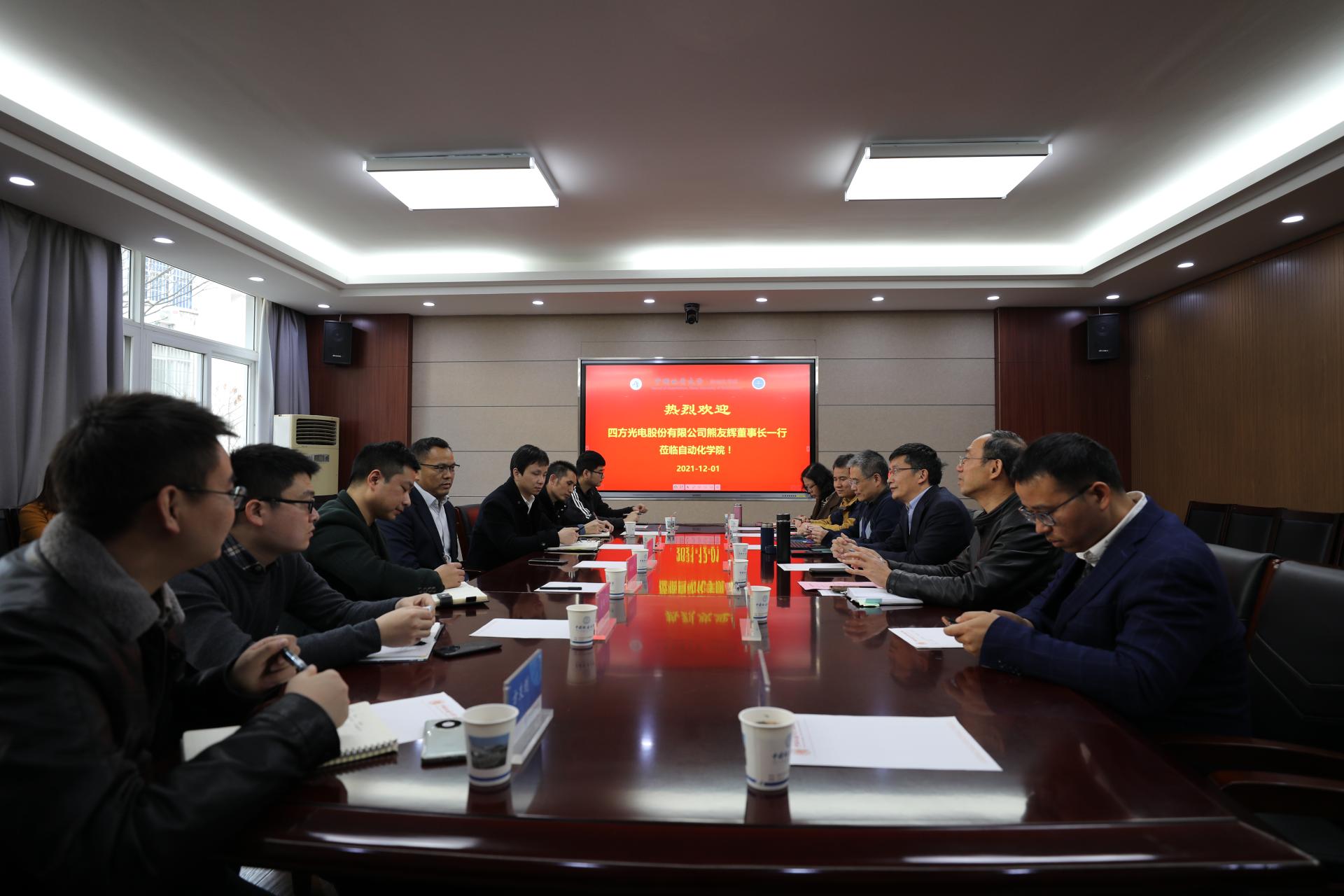 2021年12月1日,四方光电股份有限公司(简称:四方光电)董事长熊友辉一行4人应邀来永利官网交流,院长曹卫华、院党委书记董浩斌、副院长陈鑫以及相关科研实验室负责人参加交流座谈会。