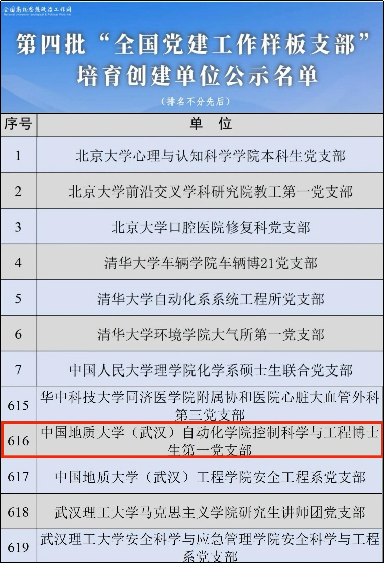 近日,教育部公布了第四批新时代高校党建示范创建和质量创优培育创建单位名单,其中,永利集团3044官网欢迎您控制科学与工程博士生第一党支部作为学校首个研究生党支部创建单位,入选“全国党建工作样板支部”,也是支部继2022年入选首批湖北省高校党建工作样板支部培育创建之后,党建工作取得的新成绩。